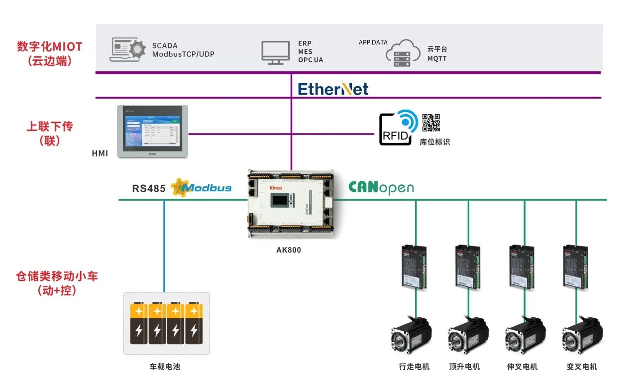 控制器采用CANopen或者EtherCAT总线控制伺服,车辆以及系统状态信息采集到HMI显示,步科物联型HMI支持OPC UA、MQTT、数据库等多种通讯方式,可通过以太网连接至服务器,为数字化提供基础数据。